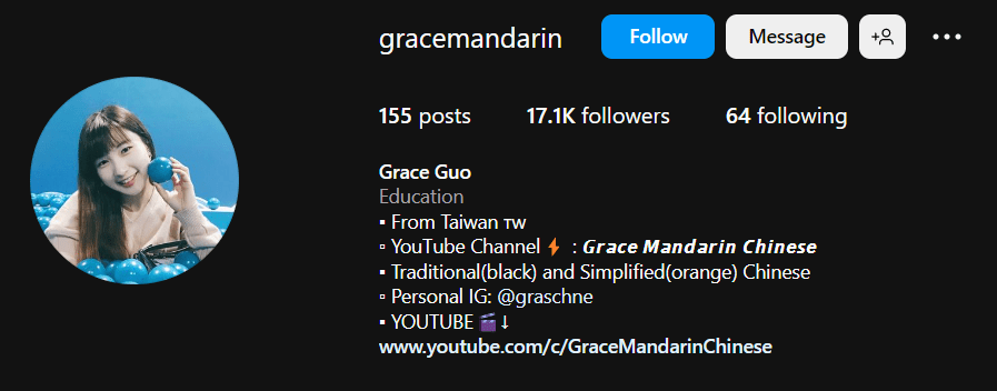 Grace’s Instagram posts are dedicated to a single vocabulary or expression, making it a great option for those who prefer to learn Chinese in small, easy-to-digest pieces. Her content is also available in both traditional and simplified Chinese. Furthermore, Grace also has a YouTube account where she shares longer and more comprehensive lessons, providing a well-rounded learning experience for her followers.