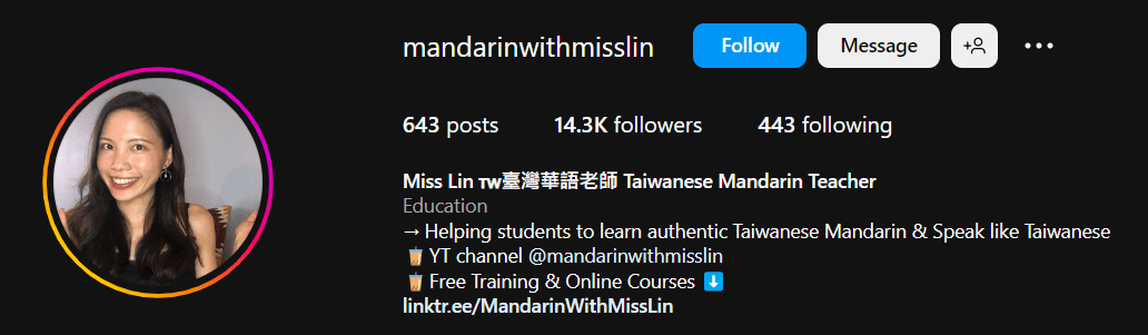 Miss Lin’s Instagram account is a valuable resource for those planning to live in Taiwan, as she shares Chinese vocabulary that is particularly relevant and useful for daily life in the country. Her content is presented in traditional Chinese and includes annotations in both Bopomofo and Pinyin. In addition, Miss Lin also has her own podcast, which is an excellent tool for improving your Chinese listening skills. With her engaging and informative content, Miss Lin offers a well-rounded language learning experience that can help you become more comfortable and confident using Chinese in your daily life.