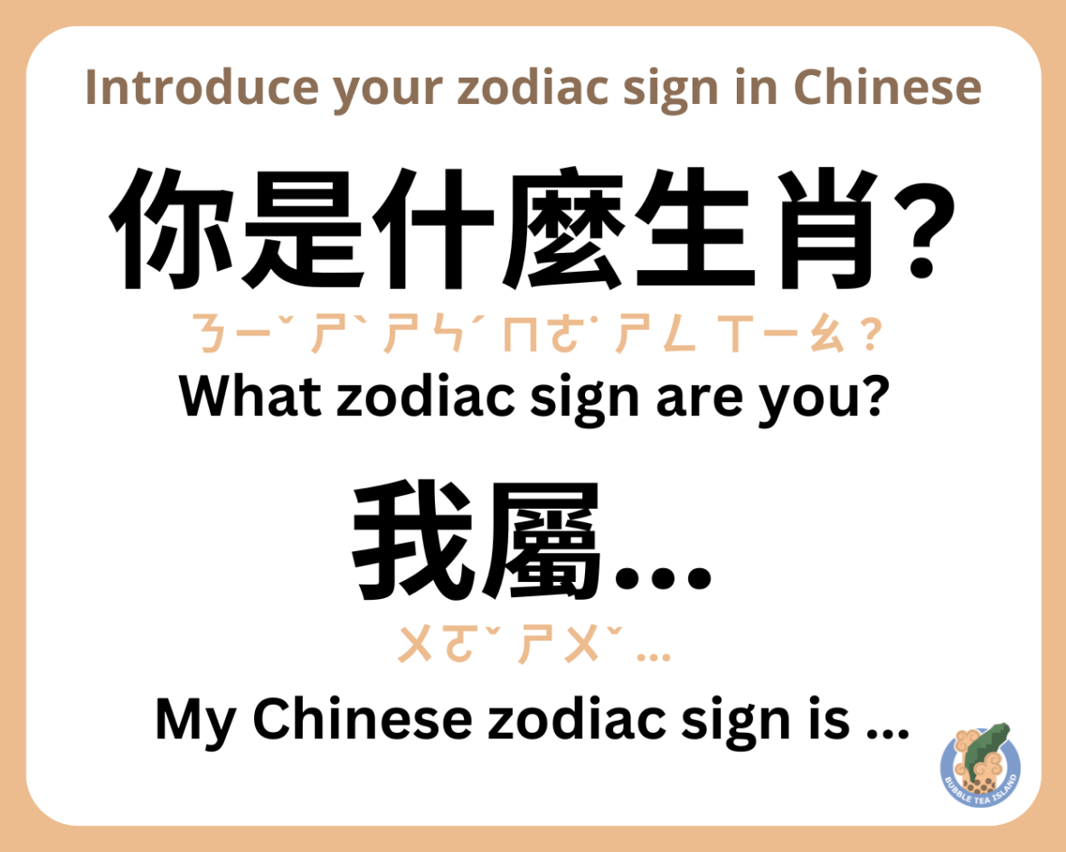 | 你屬什麼? | ㄋㄧˇ ㄕㄨˇ ㄕㄣˊ ㄇㄜ˙ ? | nǐ shǔ shén me? | What is your Chinese zodiac sign? |