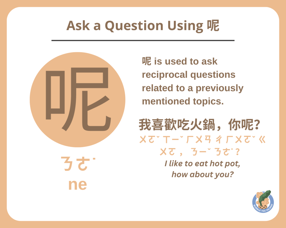 The question particle 呢 (ㄋㄜ˙ – ne) is also commonly used in Mandarin Chinese. Unlike 嗎, which is used to ask yes-no questions, 呢 is used to ask reciprocal questions related to a previously mentioned topics. Here are three sample sentences that illustrate the usage of 呢: