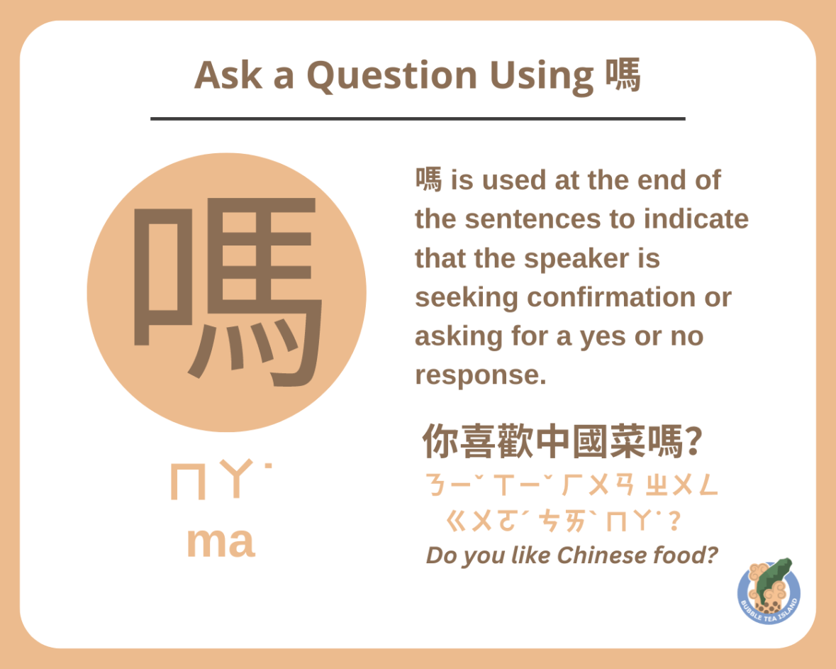 - 嗎 is used to form yes-no questions, seeking confirmation or a simple “yes” or “no” answer.
