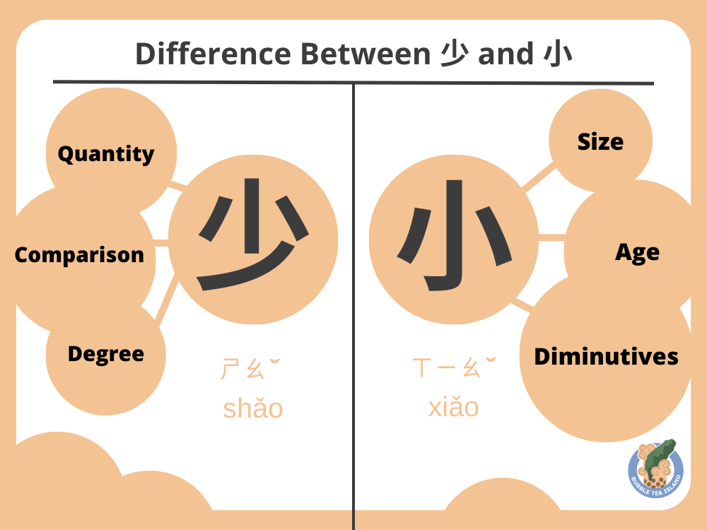 While both 少 and 小 may seem similar, their usage in Chinese is distinct. 少 is primarily concerned with quantity and scarcity, indicating a smaller amount or a deficiency. On the other hand, 小 is more focused on the physical size, age, or scale of something, describing things as “small” or “little.”