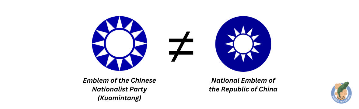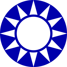 The KMT’s logo features a white sun with twelve rays on a blue background, resembling the national emblem of the Republic of China. The KMT’s emblem differs from the ROC’s in proportions; the ROC’s sun is smaller with more prominent blue sky, while the KMT’s sun rays extend to the borders of the emblem.
