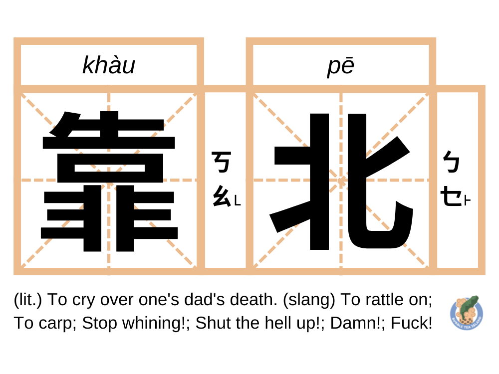 The term 靠北 is actually a phonetic transliteration of the Taiwanese Hokkien phrase 哭爸 (pronounced khàu‑pē in the Tailo Romanization system). Literally, it means “to cry over one’s dad’s death.” However, its modern usage in Taiwanese slang is far removed from this mournful context.