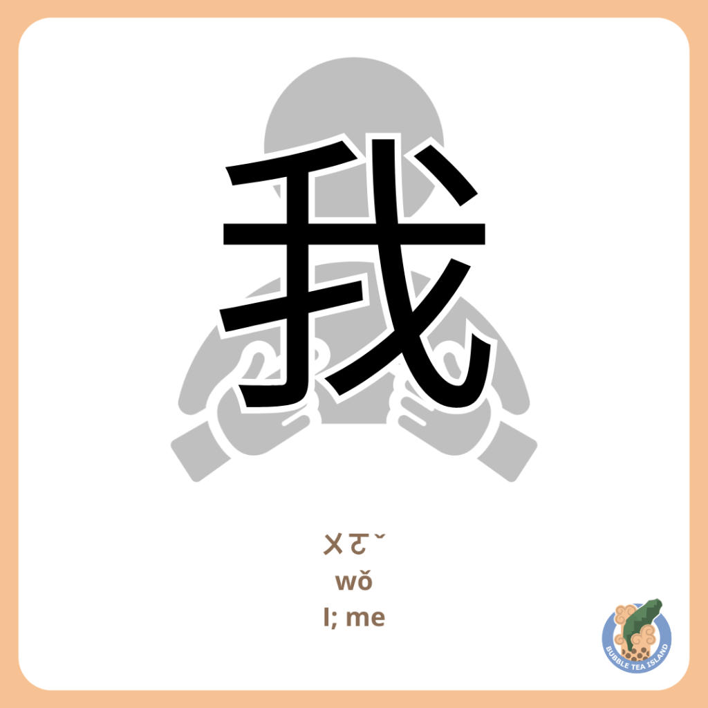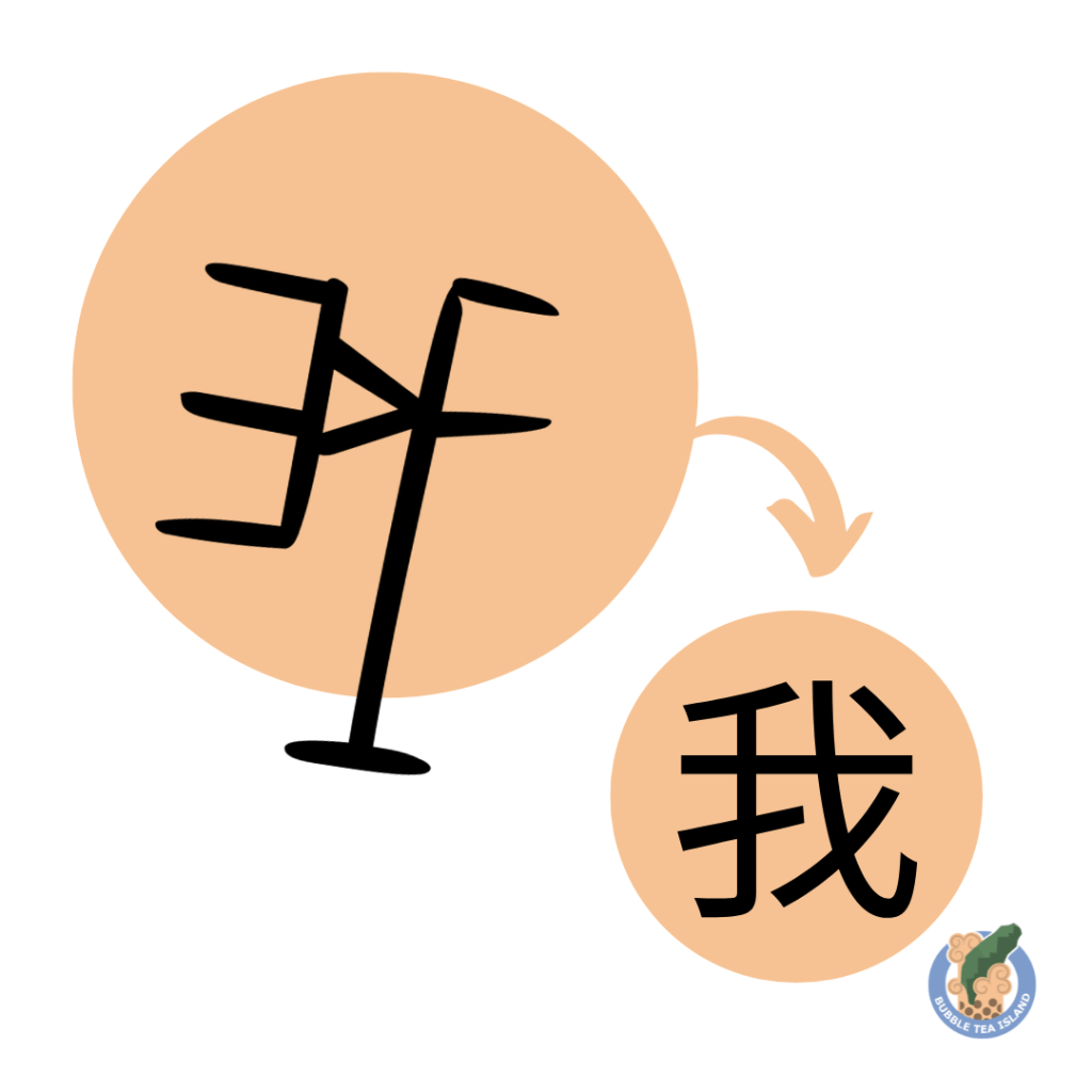 Over time, the character 我 was borrowed for its sound to represent the first-person pronoun “I” as early as the oracle bone script period. Folk etymology interprets the character as an ideograph combining a hand (手, shǒu) holding a weapon (戈, gē), symbolizing self-defense or the protection of oneself, metaphorically linking it to the concept of self or “I.”