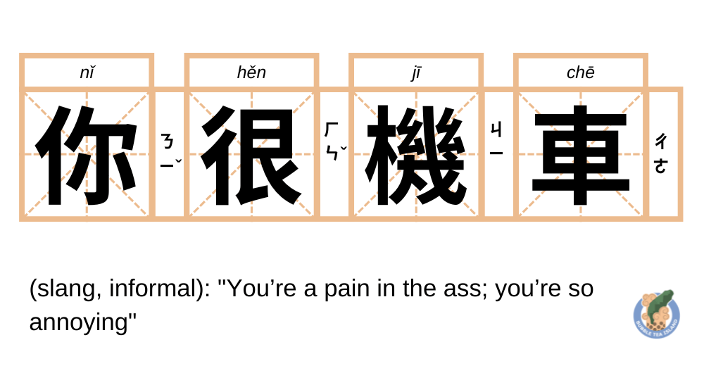 | 你很機車 | ㄋㄧˇ ㄏㄣˇ ㄐㄧ ㄔㄜ | nǐ hěn jī chē | You’re very motorbike | You’re annoying, stubborn, or hard to deal with |
