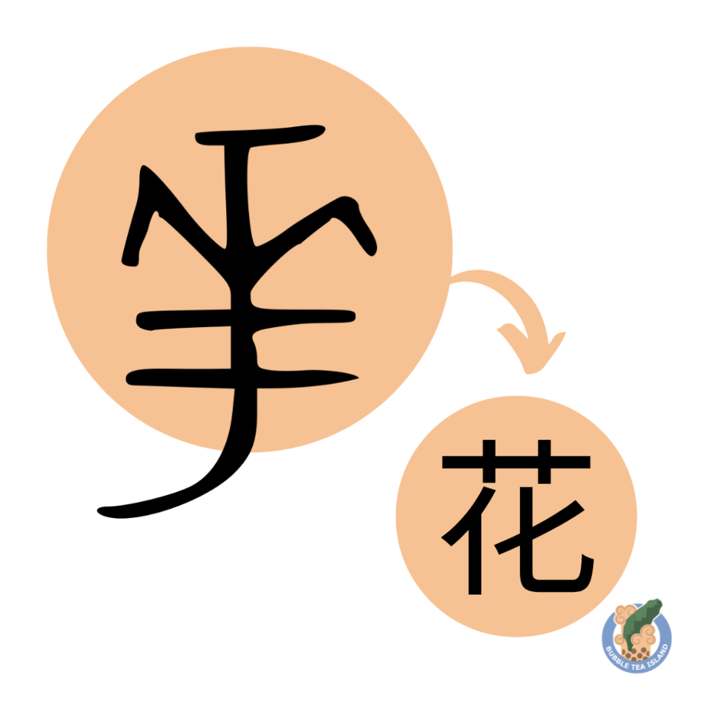 花 is a phono-semantic compound that combines the semantic element 艹 (cǎo, meaning “grass” or “plant”) with the phonetic component 化 (huà). This structure reflects both the character’s meaning and its pronunciation. Historically, the character evolved from 𠌶 or 華 before the Han dynasty, linking it to broader concepts of splendor and flourishing.