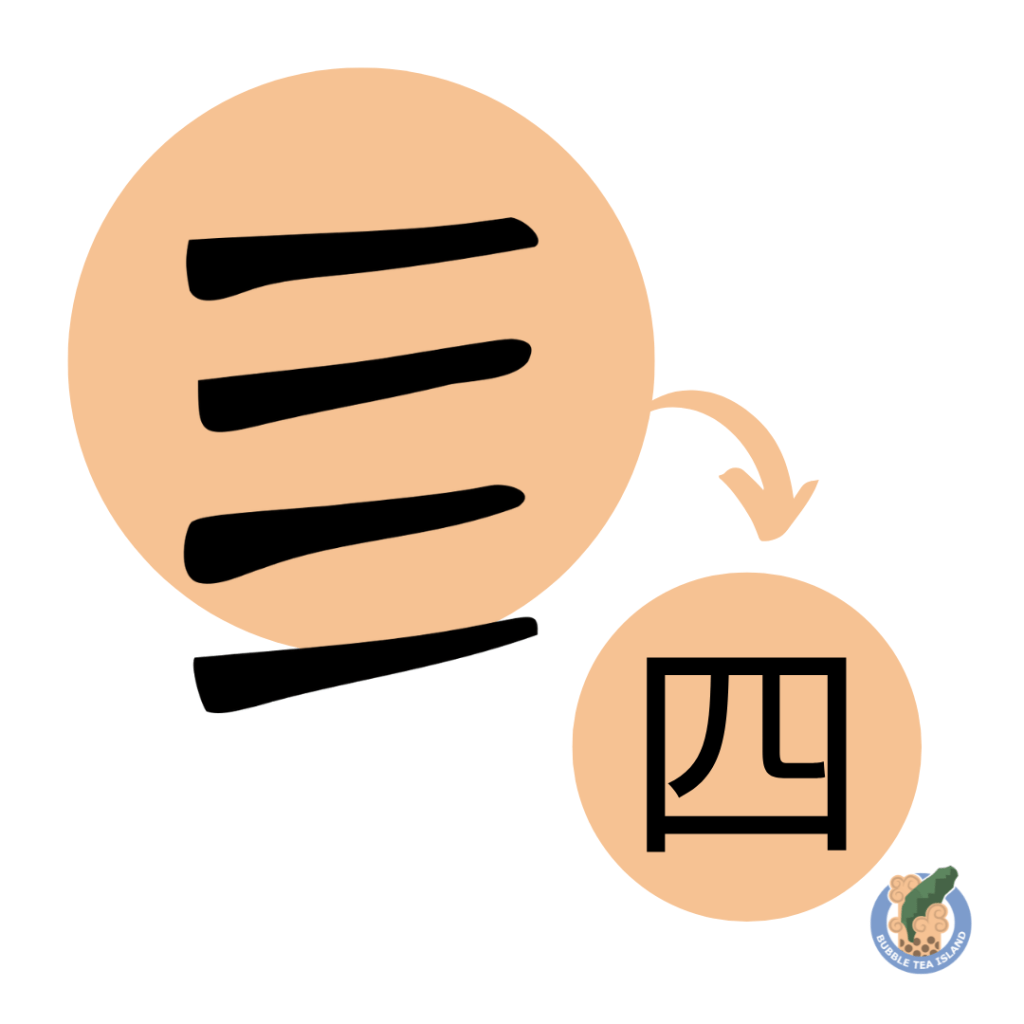 The Chinese character 四 has a rich historical evolution. Originally written as 亖 during the Western Zhou period, its form was later changed to 四 in the late Spring and Autumn period to avoid confusion with 二 (“two”) or 三 (“three”) in vertical writing. This change was standardized during the Qin dynasty.