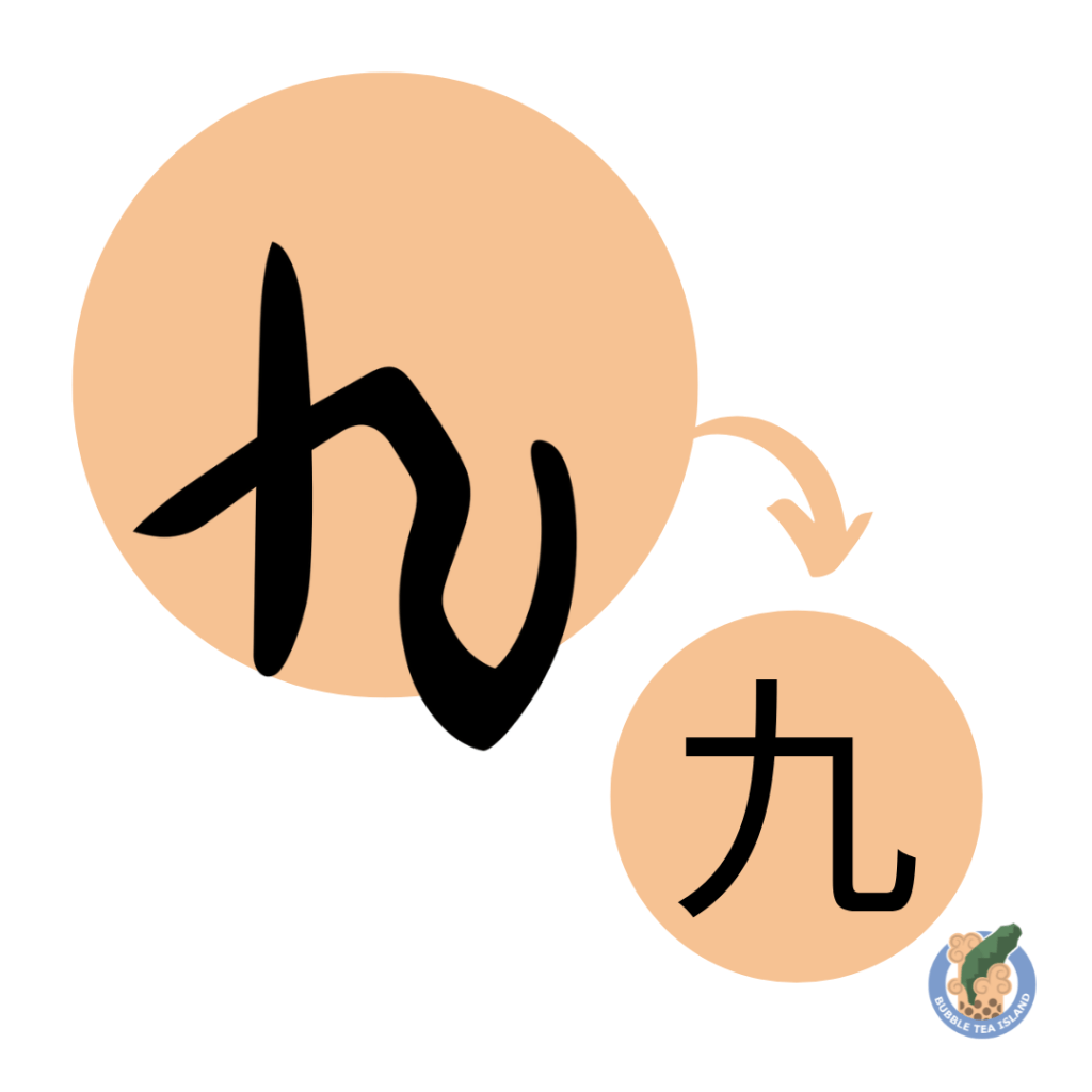 The Chinese character 九 originated as a pictogram depicting a stylized hand or forearm with a bent wrist, symbolizing an elbow. Its earlier forms resembled characters like 手 (shǒu, “hand”) and 寸 (cùn, “inch”). Initially, 九 meant “elbow,” a meaning now conveyed by 肘 (zhǒu). Over time, this original meaning faded, and 九 came to represent the number nine. The metaphor of a fist tightening or “bumping up” against ten reflects the character’s symbolic progression within the numeric system.