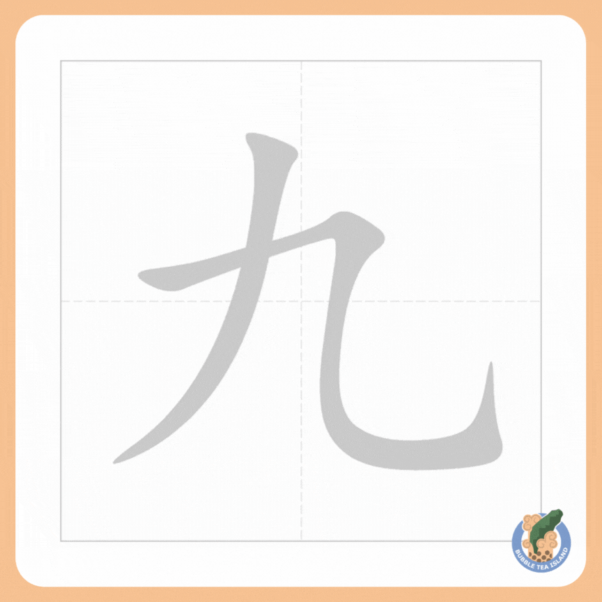 九 is the character for “nine”. It is made out of 2 strokes.
