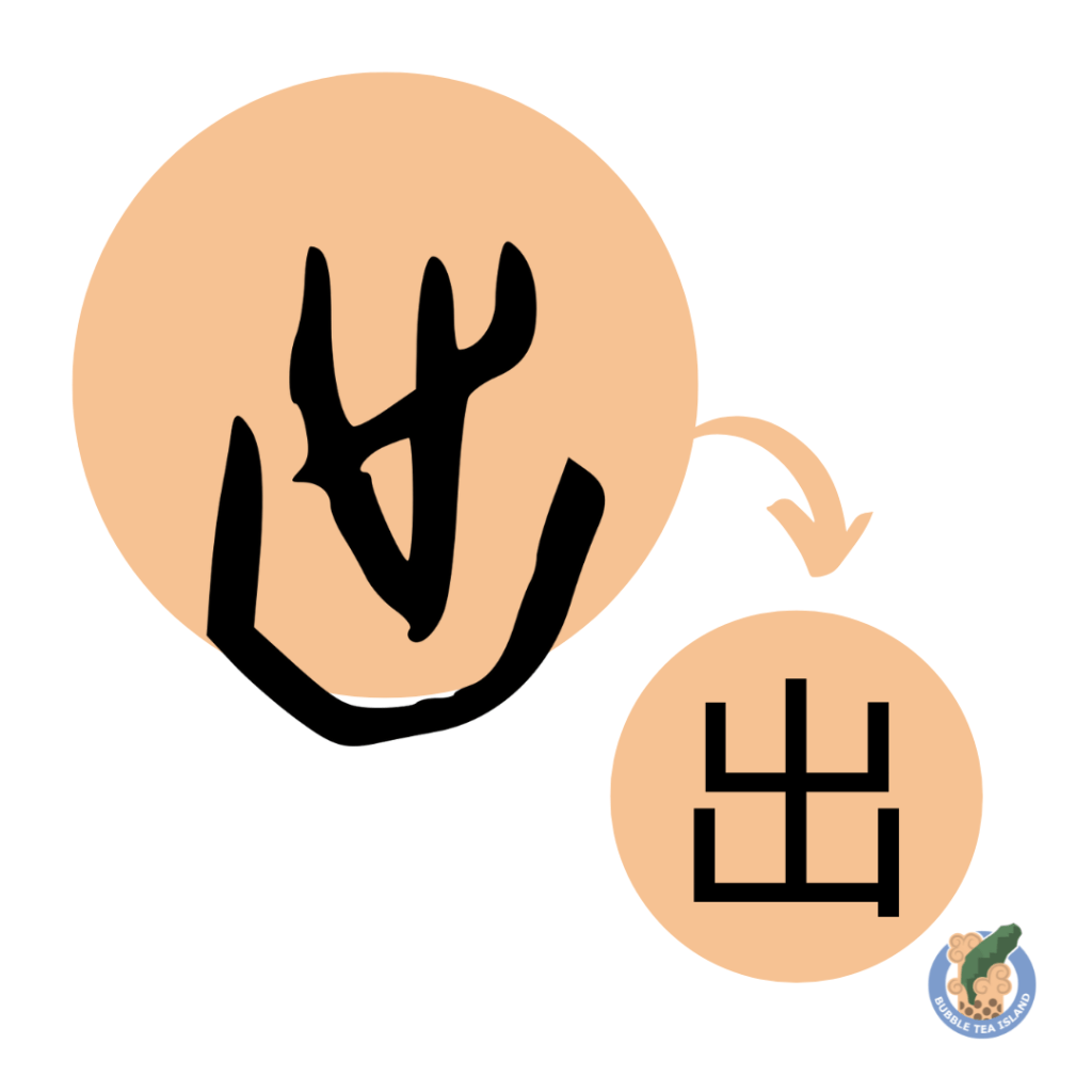 Over time, especially by the Qin dynasty, the original structure became stylized and distorted. This led to a misinterpretation in the Shuōwén Jiězì (《說文解字》), an ancient Chinese dictionary, which incorrectly described 出 as a pictograph of a plant (屮) growing upward and out.